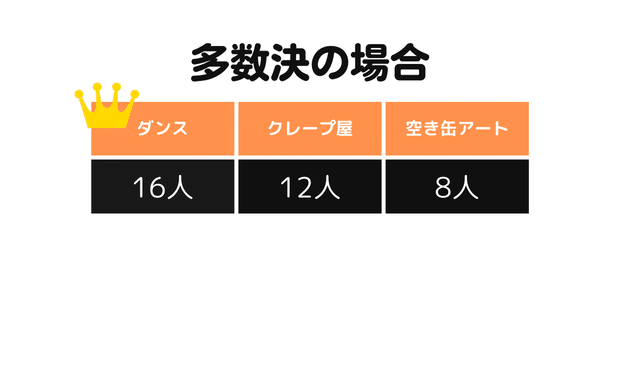 このような投票の場合、1番人数の多い「ダンス」が、クラス全員で決めたものとして、認められます。