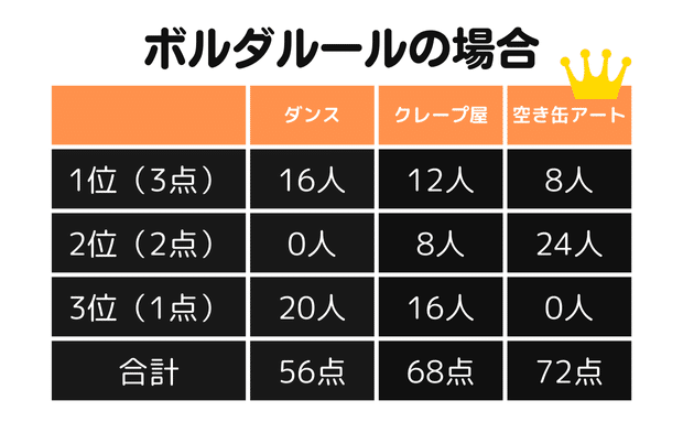 「ダンス」と「クレープ屋」で、決選投票をする方法もあります。