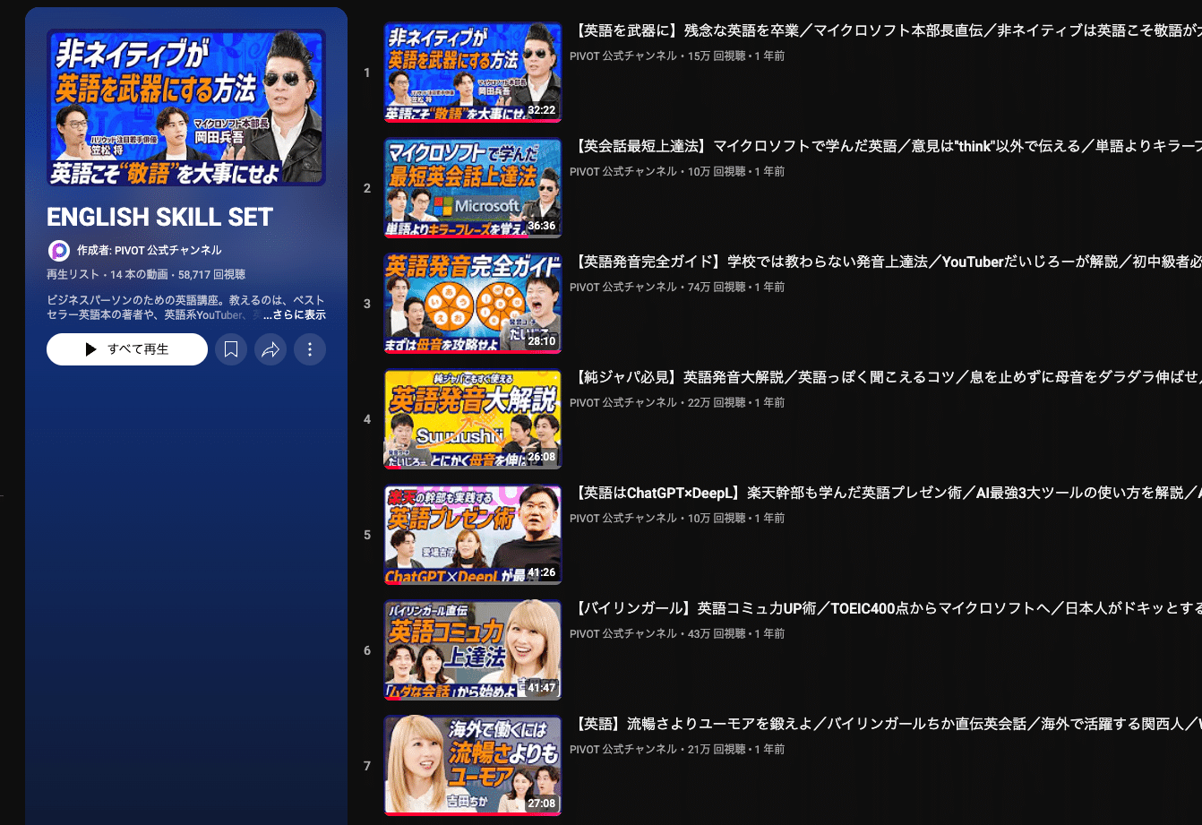 今回は「PIVOT 公式チャンネル」の「ENGLISH SKILL SET」という再生リストを使用します。このページに移動しましょう。