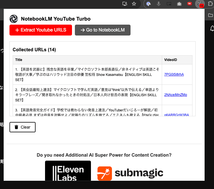 次に表示される「Extract Youtube URLs」というボタンを押すと、リストにある動画のURLをすべて取得します。(上限は50個)