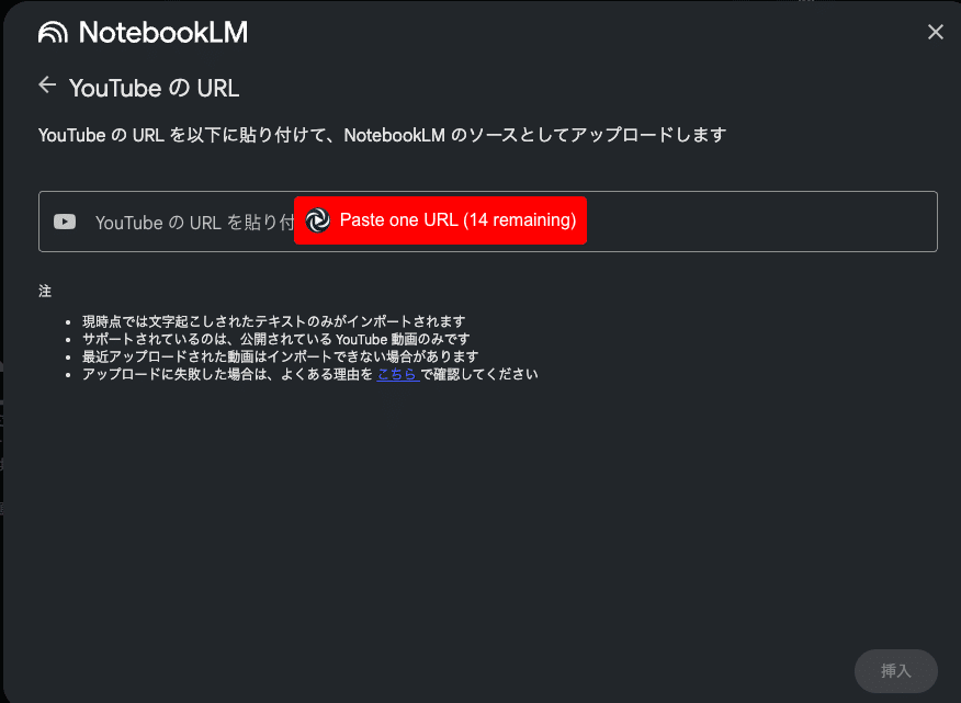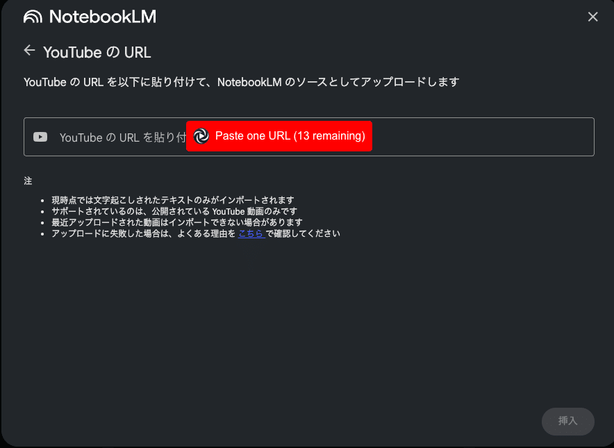 ※複数の動画のURLを一括で追加することは、NotebookLMの仕様上できません。